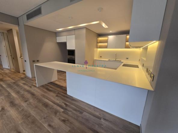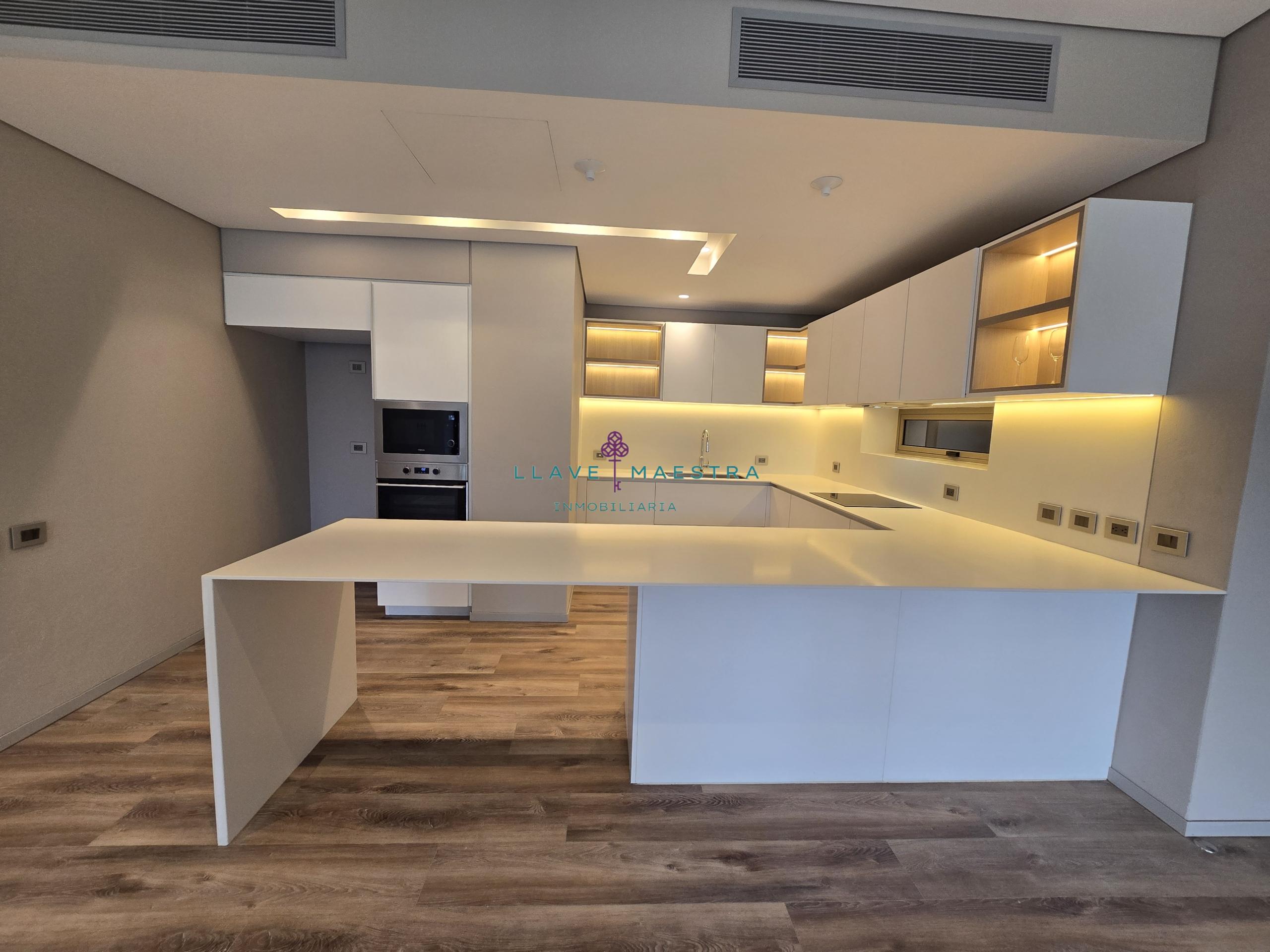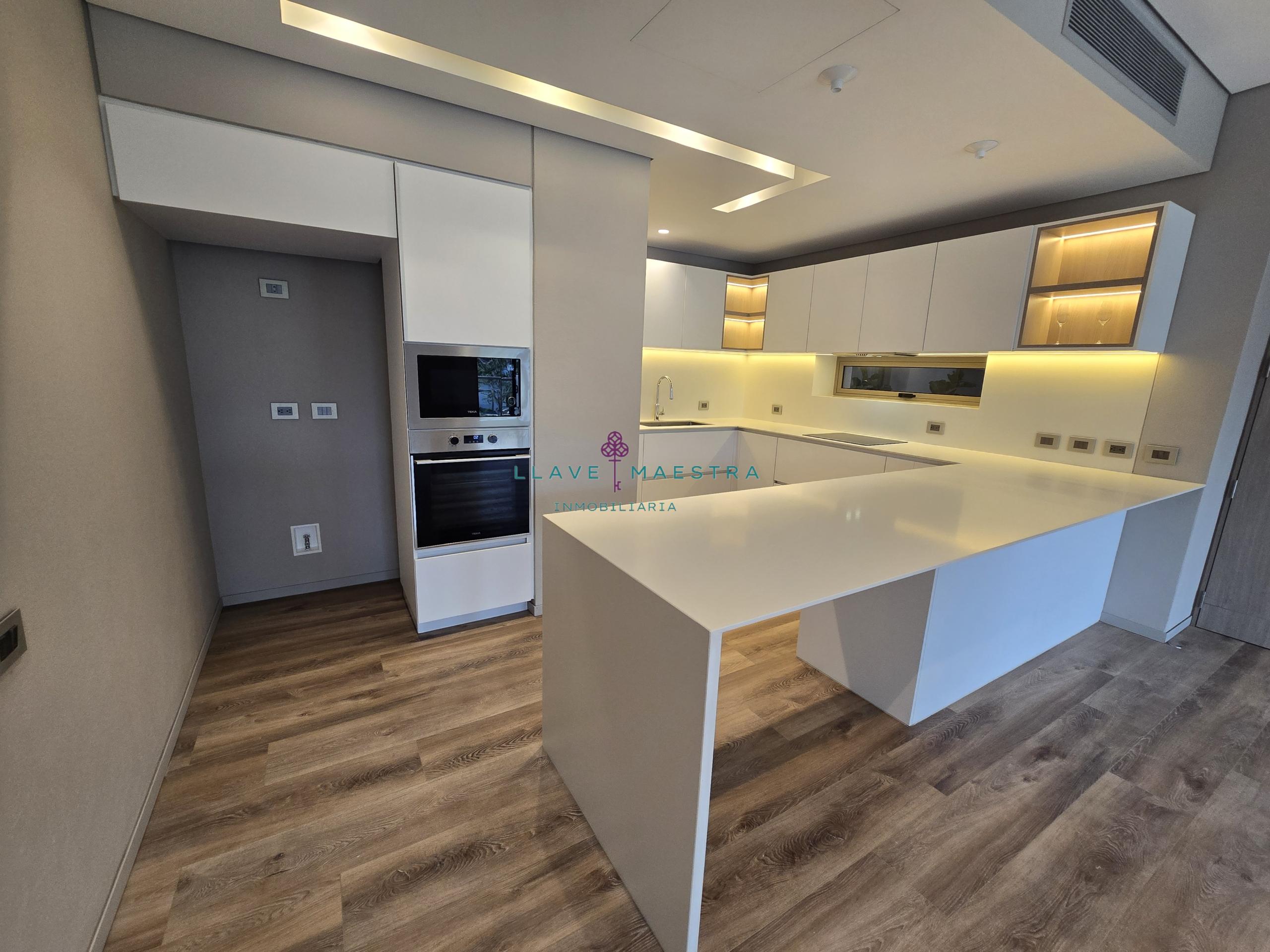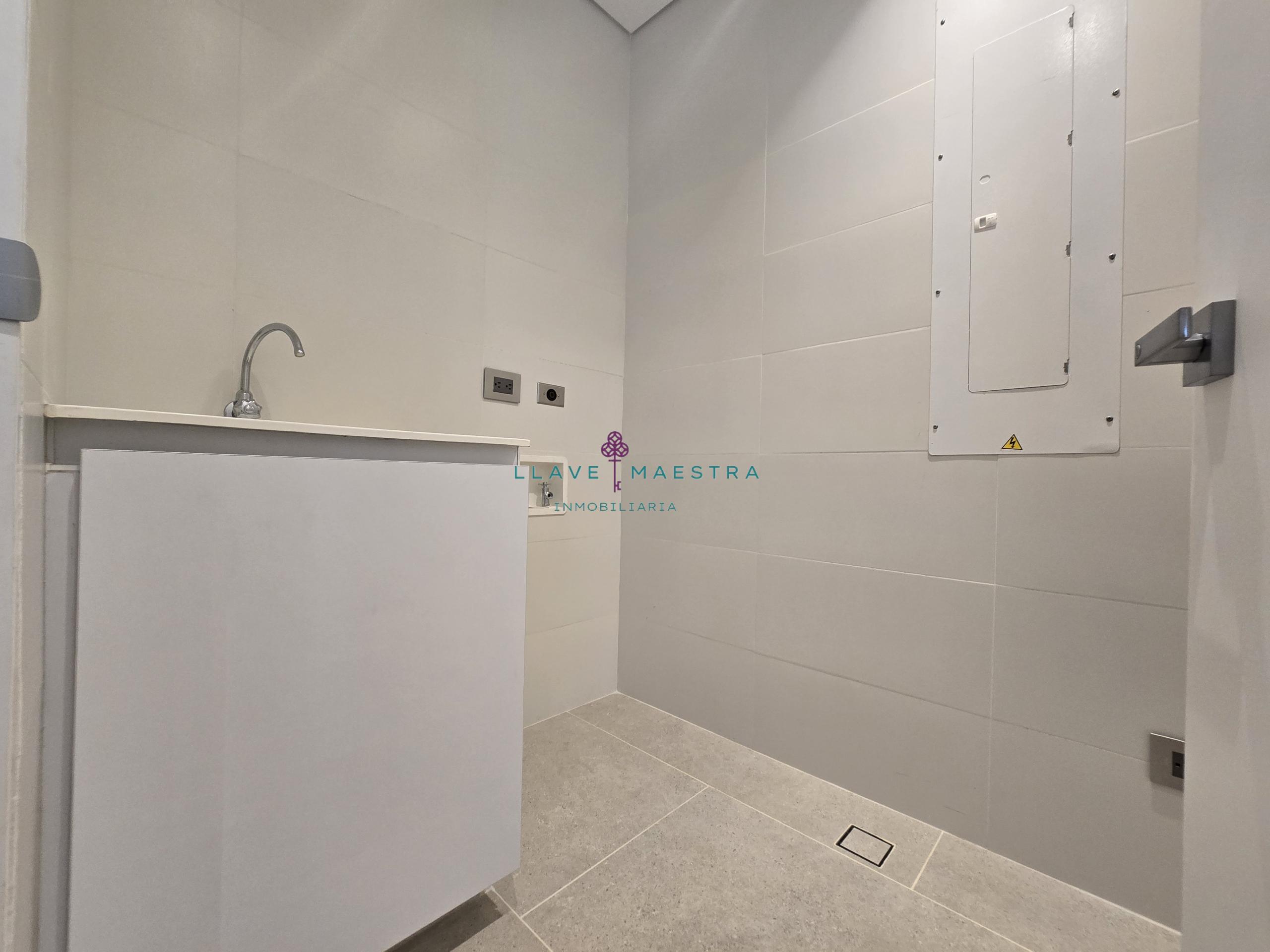 Cocina tipo americana con isla y zona de ropas independiente