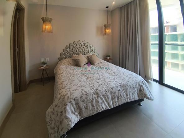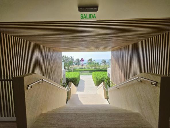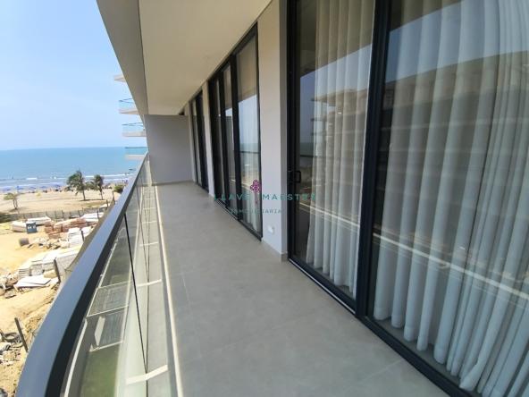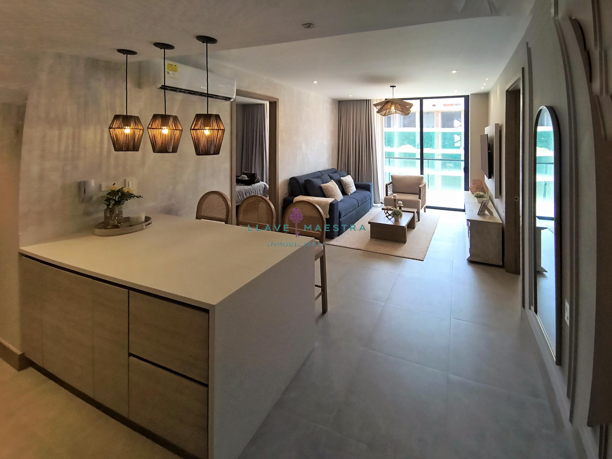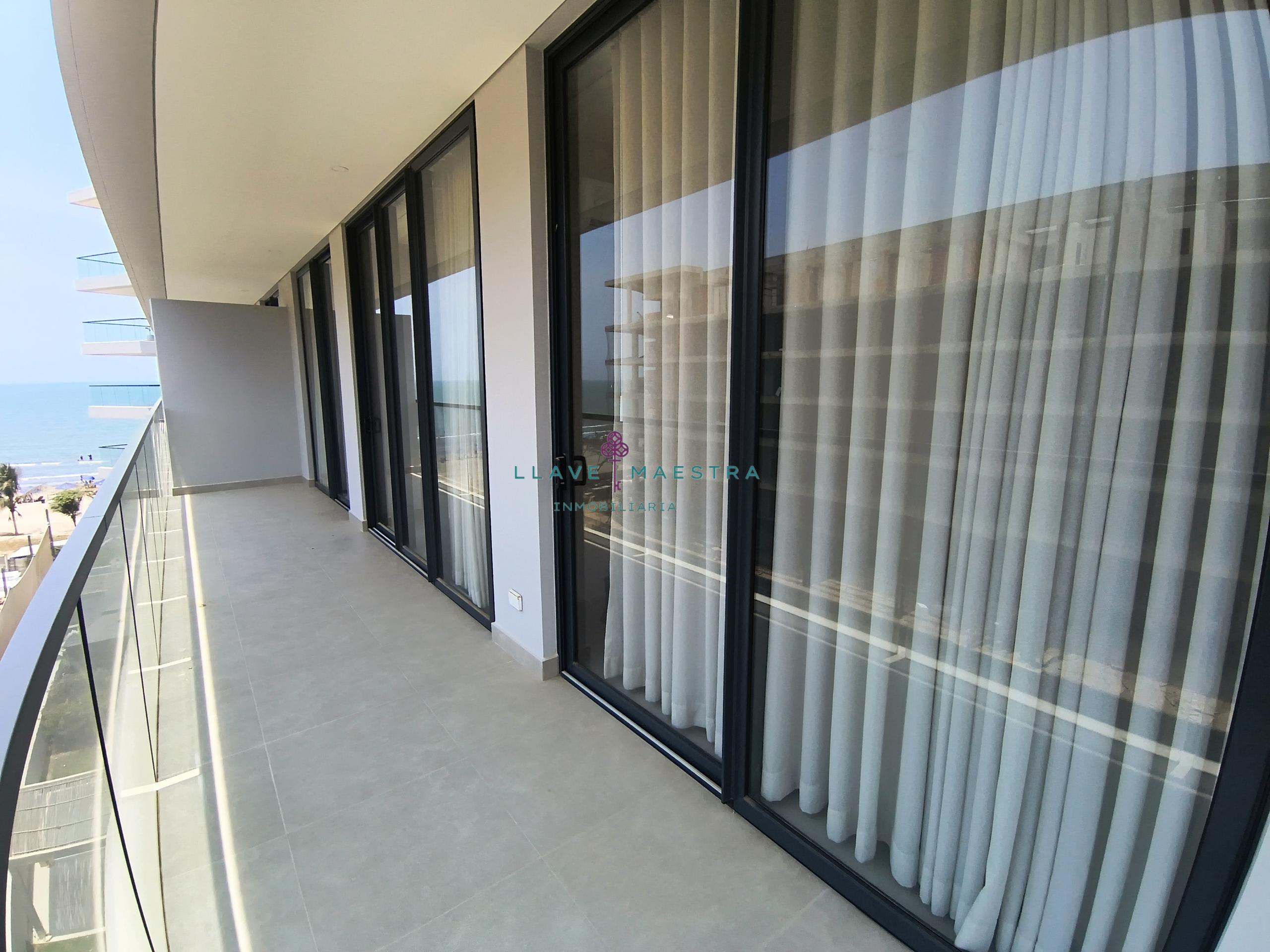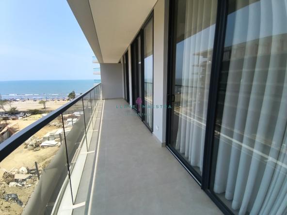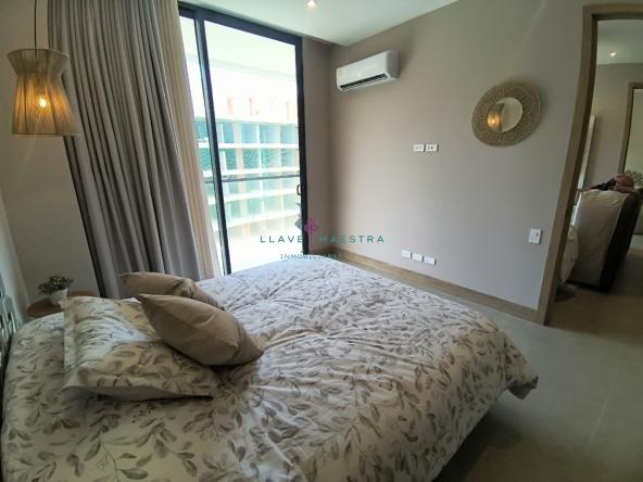 2 habitaciones, habitación principal con baño privado y walk-in closet, habitación auxiliar con clóset, ambas habitaciones con salida directa al balcón, amplia sala – comedor, cocina integral tipo americana completamente dotada, balcón amplio con vista al mar, zona de labores independiente, depósito y 2 parqueaderos.